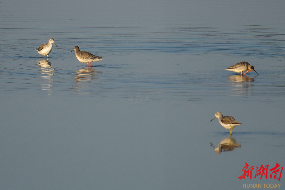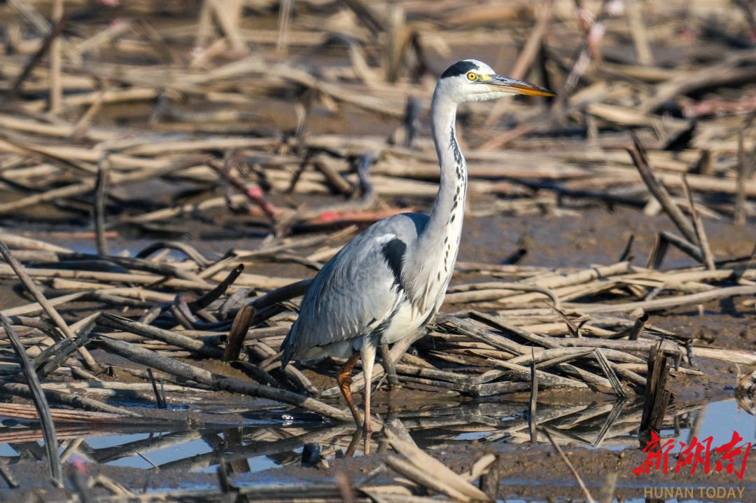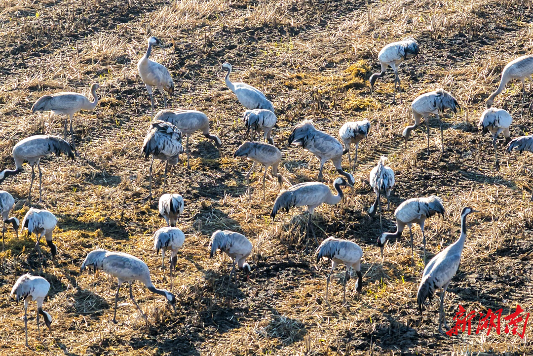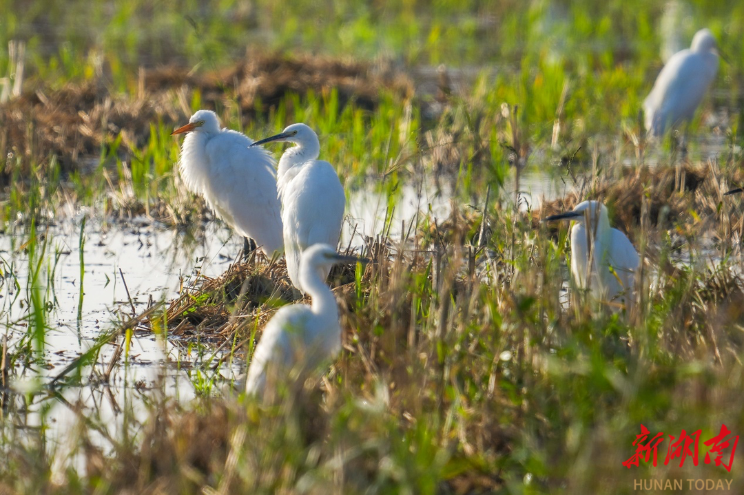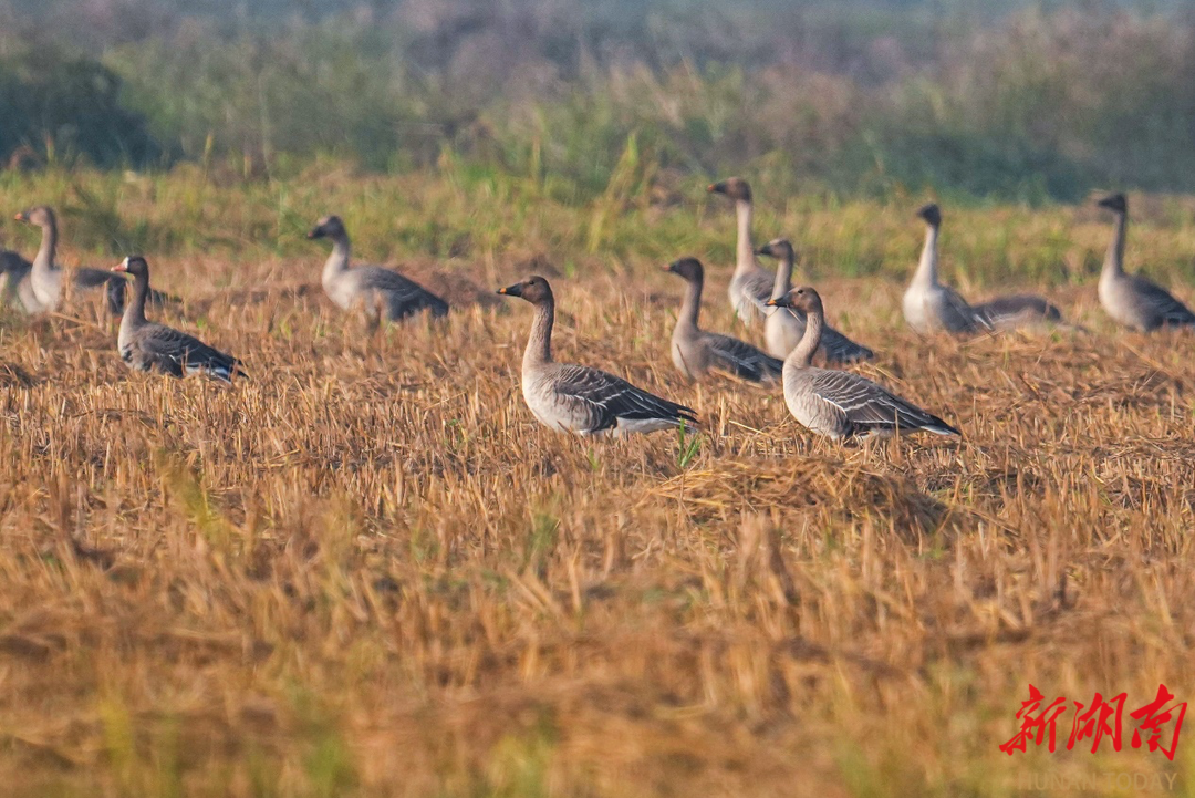 11月19日清晨5点多,气温还在2至3℃中徘徊,我便背负器材踏上寻找候鸟的晨霜。汨罗江八里堤的晨光中,鹤鹬与䴙䴘在水面轻划,涟漪搅碎了橘色朝阳;凤凰村的田野上,灰鹤时而低头啄食,时而振翅腾空,黑影掠过金色稻茬。豆雁总是最警觉的,远远集群却不肯靠近,唯有白鹭在湿地藕塘自在停歇,洁白的羽衣沾着露水,特别是国家一级保护动物黄嘴白鹭特别惹人爱怜。