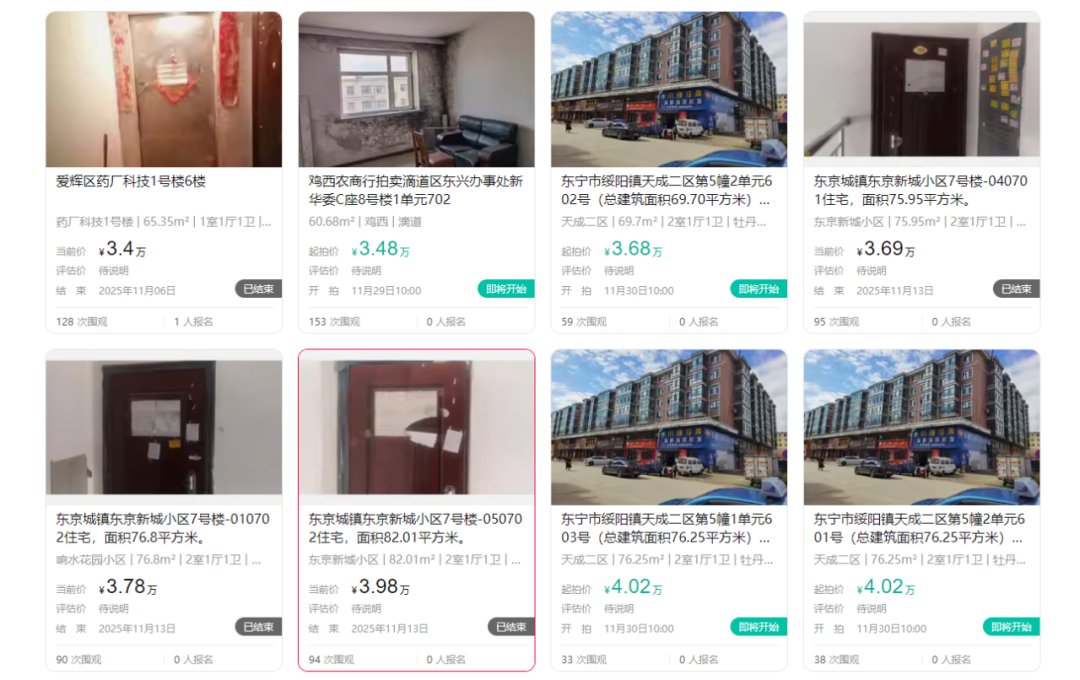 举例来说,11月10日,兰州农商行在京东资产平台挂牌158套“育才壹品”住宅。据介绍,这些住宅位于沈阳市沈抚新区,属于典型“学区房”。按起始价计算折合单价约2000元/平方米,远低于约5000元/平方米的市场价。虽然本次拍卖线上围观超过1200人次,但直至公开竞价结束,这100套房产均为“0次出价”状态,目前该拍卖已经撤回。