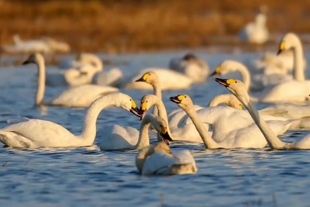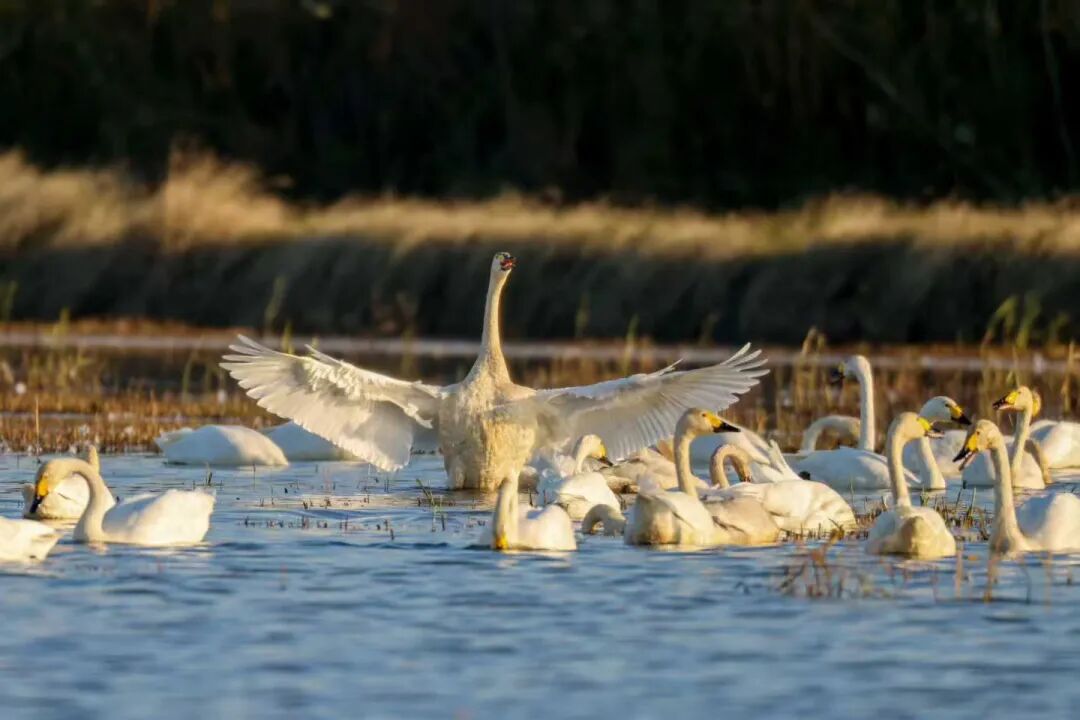 澄澈的湖水铺展成蓝玉般的镜面,倒映着天光云影。成片的芦苇荡随风轻舞,芦花如雪纷飞。就在这里,当寒潮渐起,候鸟便成了这里真正的主角。天鹅舒展着洁白的羽翼,雍容地划破湖面,溅起细碎的银鳞;雁群排着整齐的队列,在天际划出悠远而优美的弧线;鸥鹭翩跹低飞,尖喙轻点水面,叼起一尾银亮的鱼虾。它们叽叽喳喳的鸣唱,与风声、水声交织在一起,奏响了这片土地最治愈、也最富生机地自然乐章。