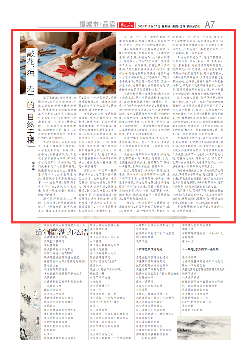 五百里滇池,奔来眼底。披襟岸帻,喜茫茫空阔无边。多级工会组织劳模疗休养的暖流,将我裹到了昆明滇池边的工人疗养院。工作人员戴讯涵许是想提升点“工匠精神”,便邀我们学一门手艺:植物拓印。还安排助手徐双莹做教练,现场教我们学“敲花”。这名字听着就有些意思,带着点朴拙的、动手的趣味。