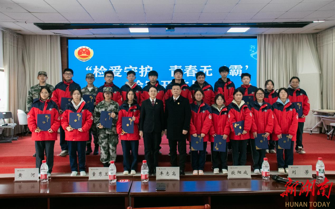 活动尾声,云溪区人民检察院党组副书记、分管日常工作的副检察长丰志高与检委会专职委员李媛珊一同将“反霸凌志愿者”聘书交到同学们手中。这份聘书不仅是一份荣誉,更是一份检校共建的契约,标志着同学们从法治的接受者转变为校园法治的践行者与传播者。