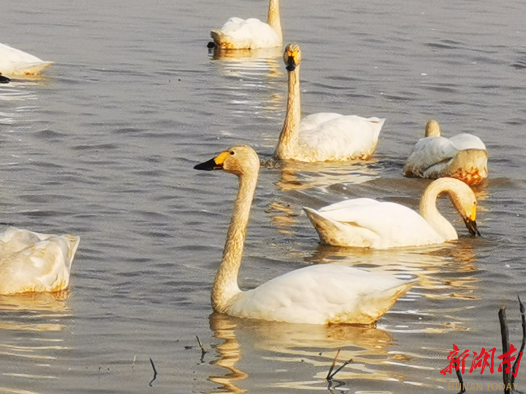 这是岳阳市屈原管理区的东古湖,这不是自然的湿地,而是大片大片的农田,或许,曾有几只歇脚的天鹅感知了水的温暖,食物的充盈,于是,它们把这片农田的包容与接纳告知了族人与朋友,它们便呼朋引伴地从最初的几只、几十只壮大到了现在的几千只。
