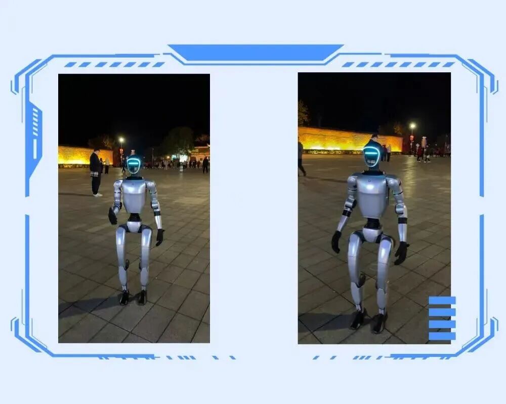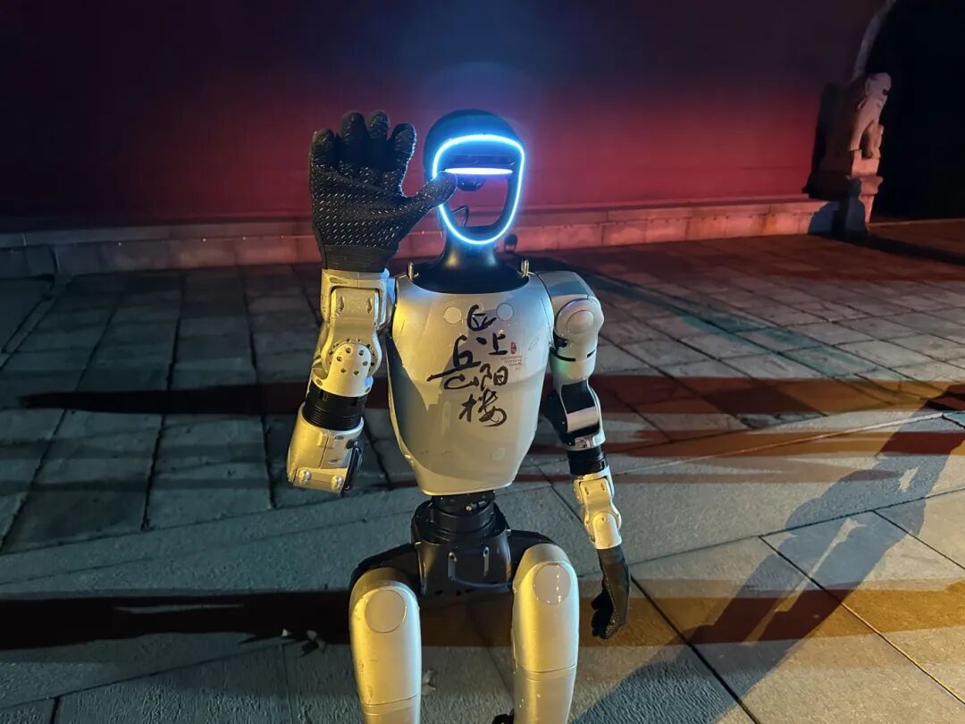 这是科技与文化的直接对话。机器人不仅参与迎宾、融入剧情,更化身“卖货郎”与游客趣味互动。随后,编队移步至岳阳楼主楼前,以整齐划一的机械舞步翩翩起舞。现场笑声与惊叹交织,千年古楼弥漫着未来气息。